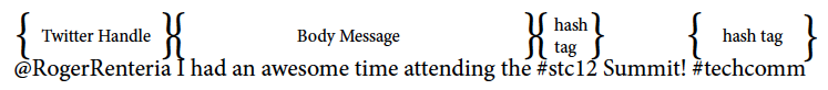 Tweets are 140 characters and may contain Twitter handles (usernames preceded with @), hash tags, lingo, and short language. Hash tags are topics that contain the # character in front of a word, like #techcomm. #techcomm signifies the topic of technical communication. Topics are abundant, for example you can find tweets that include #cats, #dogs, or whatever you prefer.